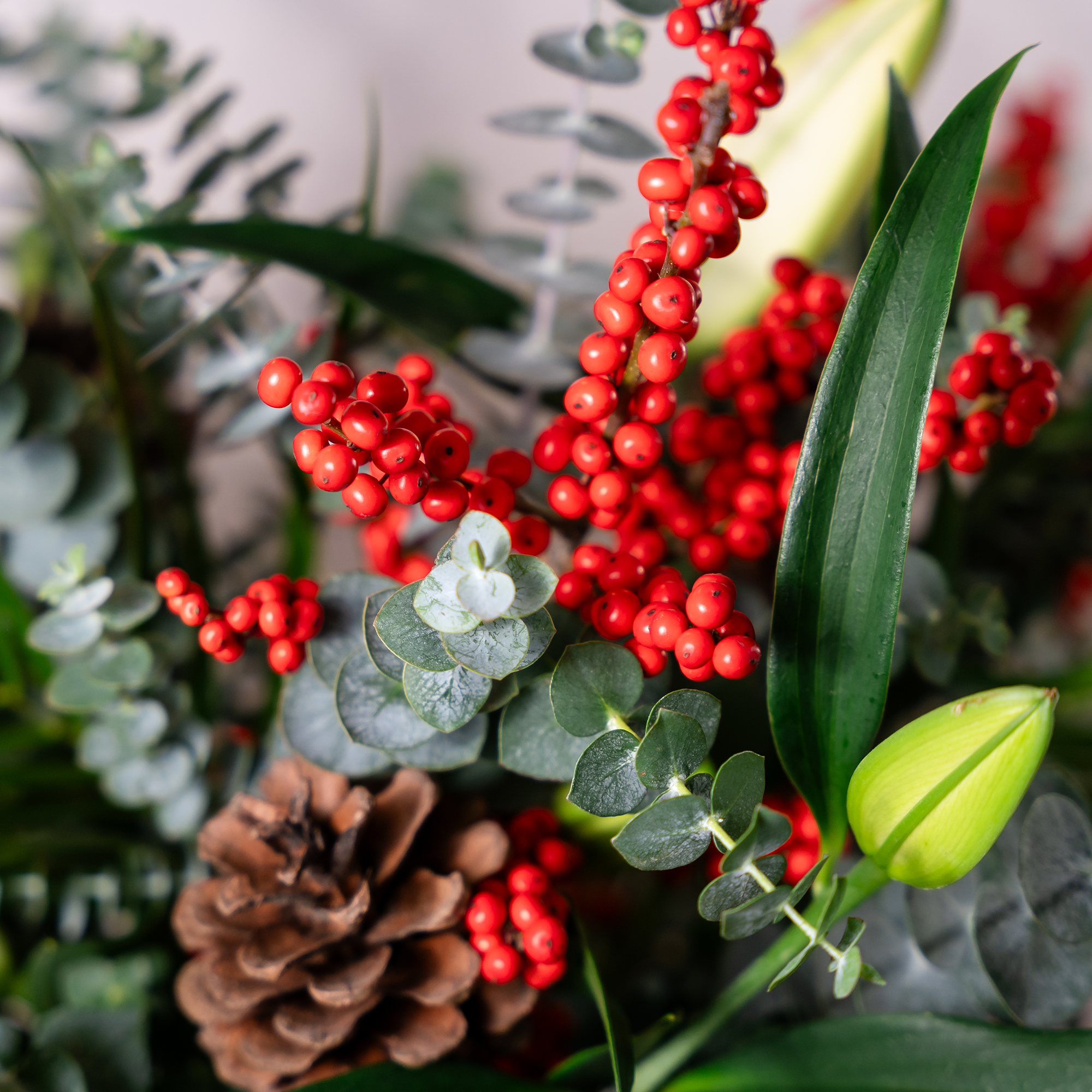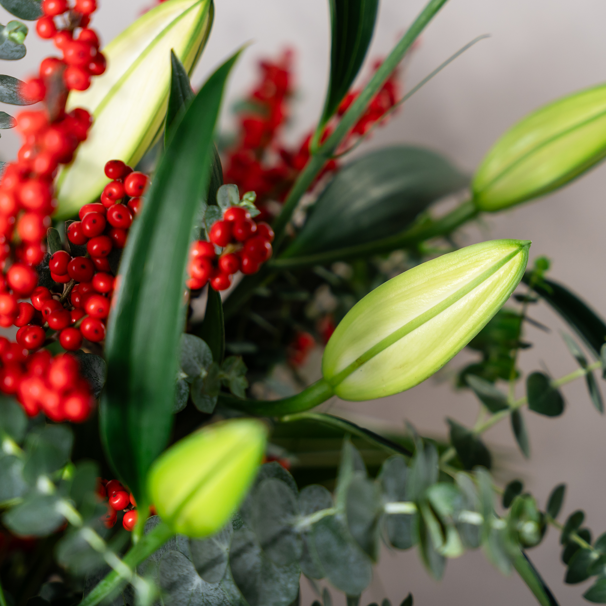 A beautiful festive classic, a hand tied bouquet of white lilies featuring