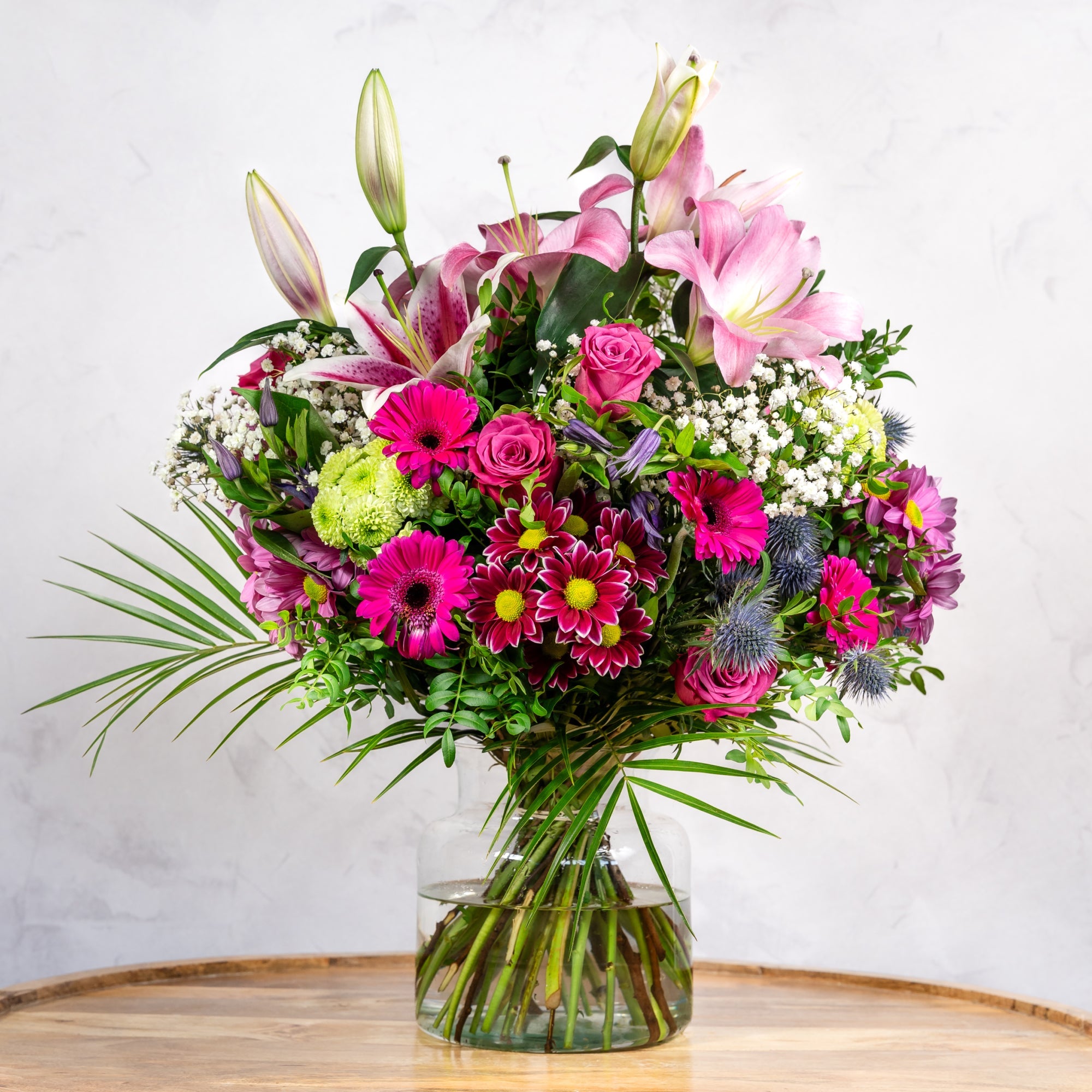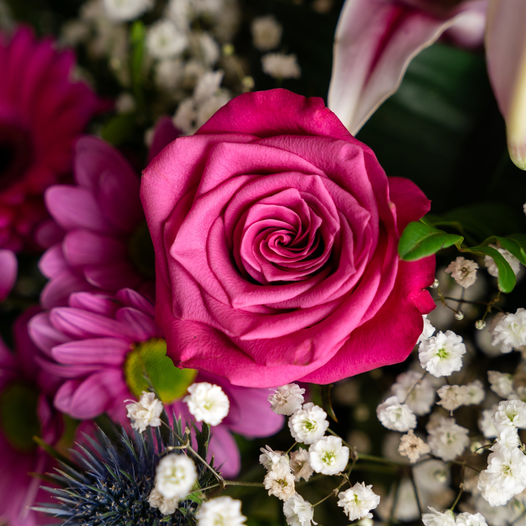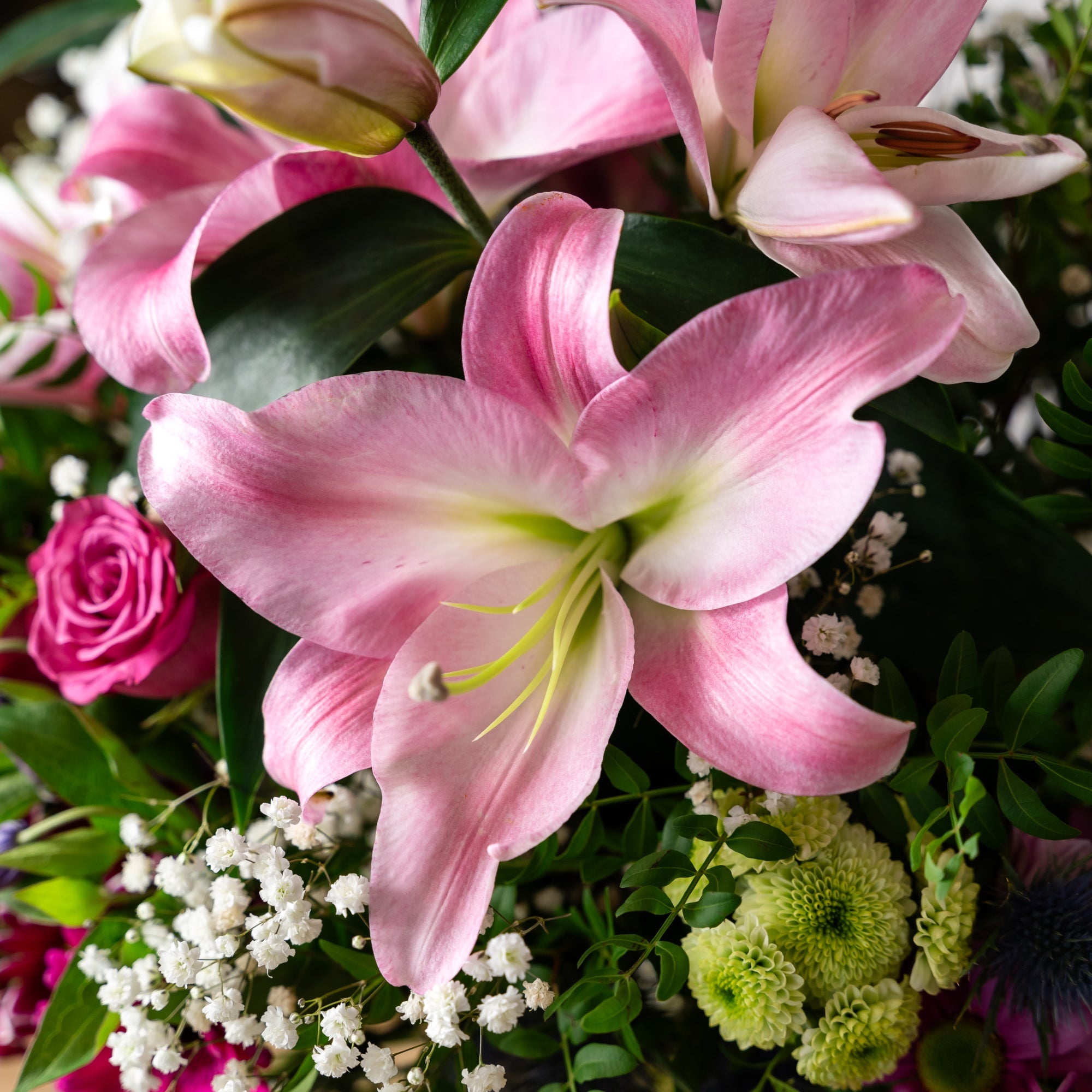 A stunning bouquet in shades of pink, including: